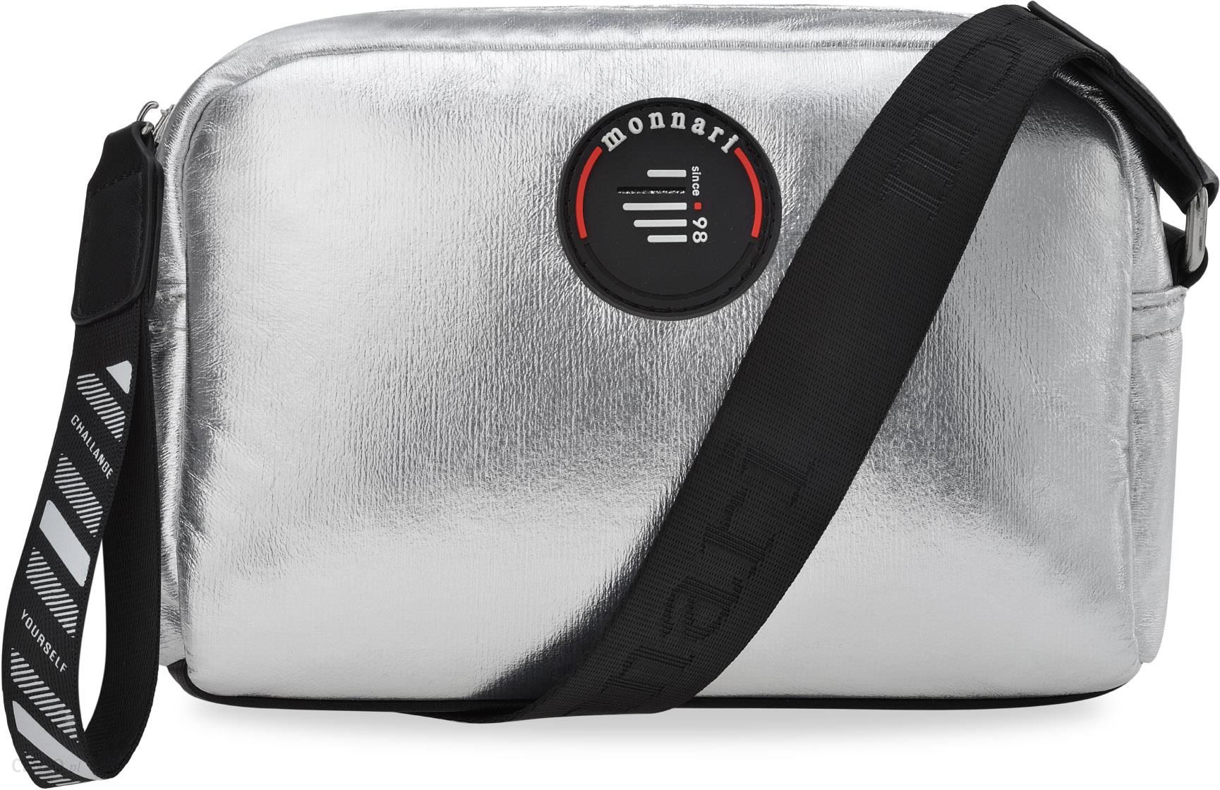 Metaliczna torebka damska monnari miękka sportowa listonoszka na szerokim pasku z breloczkiem – srebrny